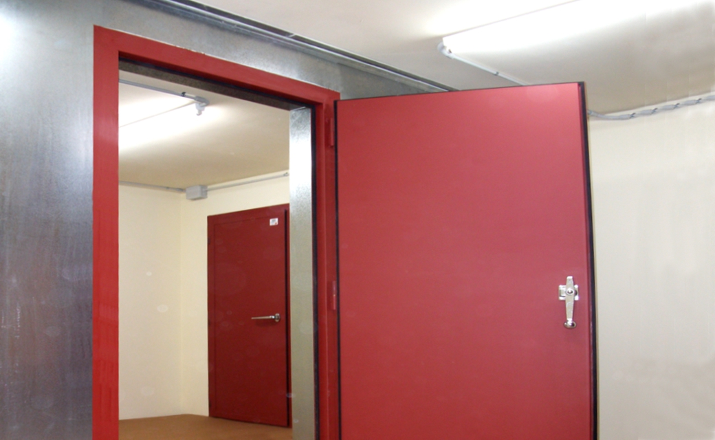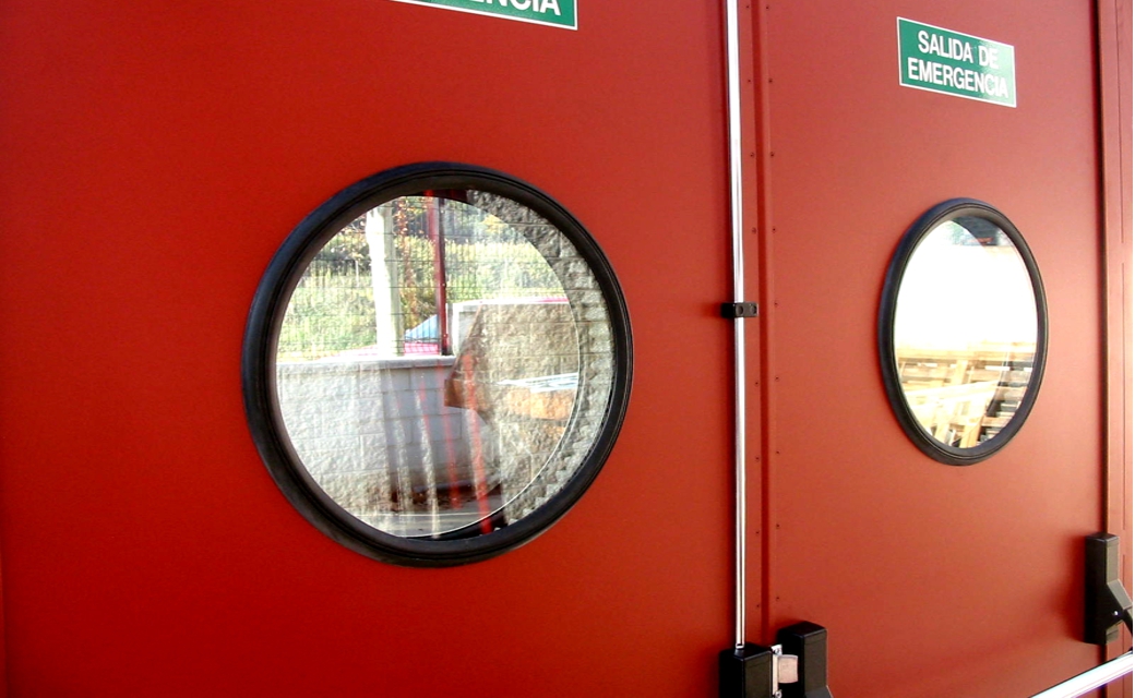 Las puertas disponen de un marco perimetral de elevada rigidez y la hoja está fabricada en chapa de acero de 1,5 mm de espesor, conformada en frío con refuerzos longitudinales interiores con lo que se consigue una gran resistencia a la torsión de la misma, manteniendo de esta forma un cierre perimetral estable con el paso del tiempo. La composición interna multicapa, basada en la combinación de materiales aislantes y absorbentes permite la atenuación del ruido evitando la transmisión al exterior.
