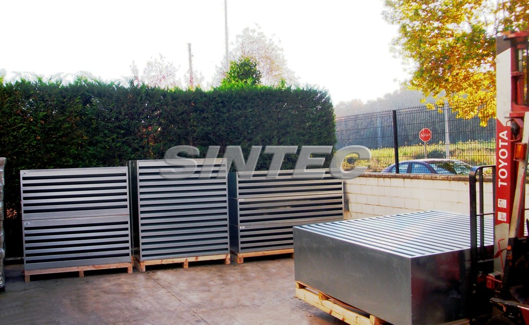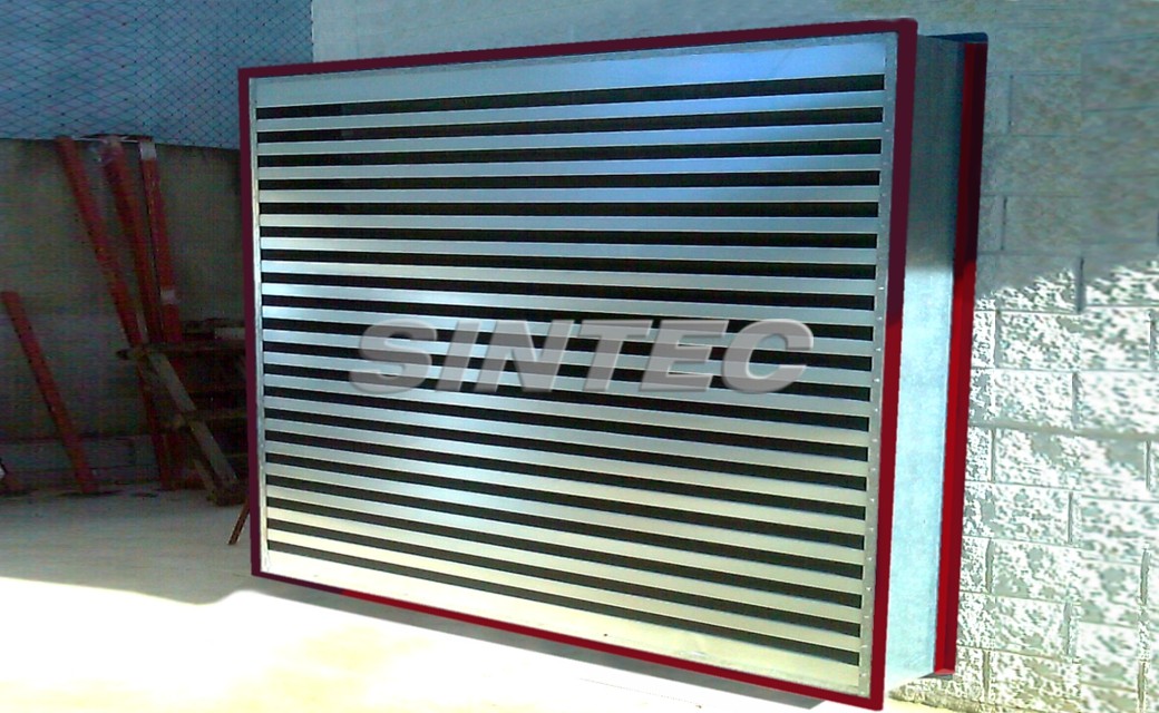 Las rejillas acústicas RSA fabricadas por SINTEC son tomas o salidas de aire acústicas de profundidad reducida. El principio de funcionamiento de una reja acústica es similar al de un silenciador disipativo de celdilla paralela. En las rejillas acústicas, las lamas absorbentes están fabricadas con chapa perforada y se disponen inclinadas en el interior de la misma.